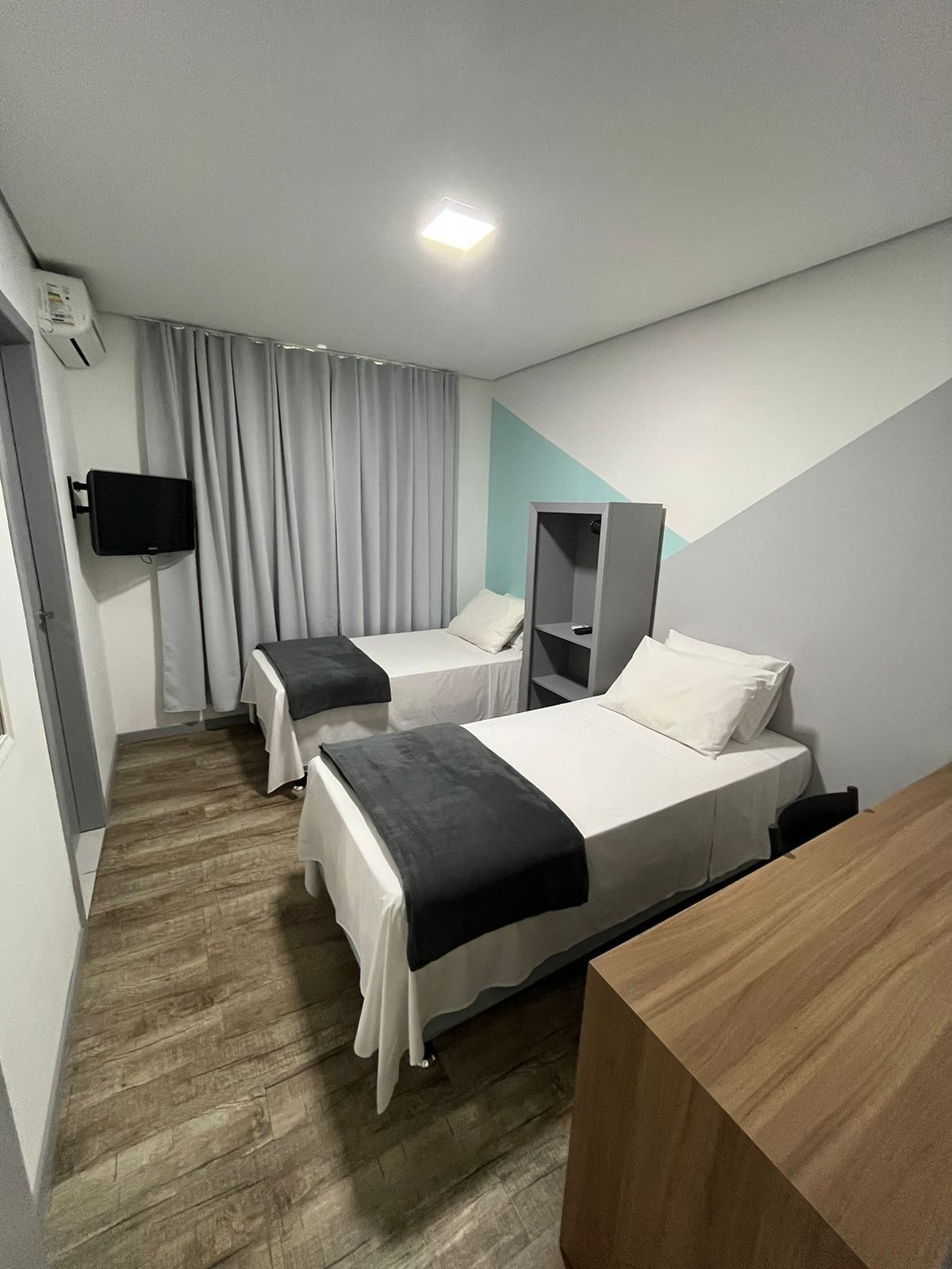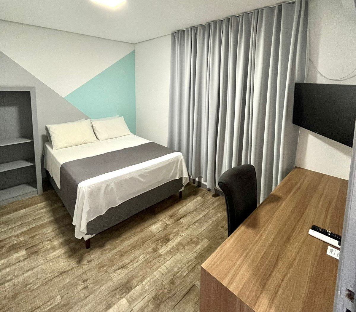 A Suíte Duplo Solteiro possui 2 camas de solteiro padrão, banheiro privativo, ar-condicionado, televisor smart, frigobar, armário e mesa de trabalho. Incluso roupa de cama, toalhas e café da manhã.